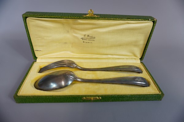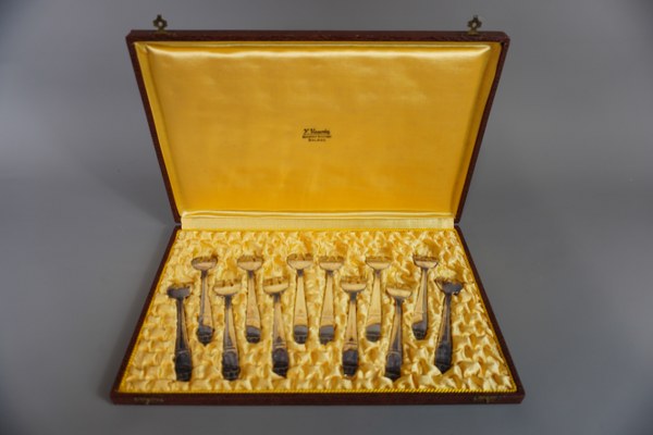 12 Fourchettes à huitre en métal argenté dans leur écrin.