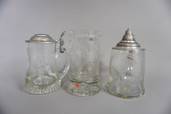 3 Choppes en verres dont 2 avec couvercles en étain.
