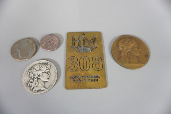 Plaque de L'Hôtel Malherbe n°308, 2 médailles de table et..