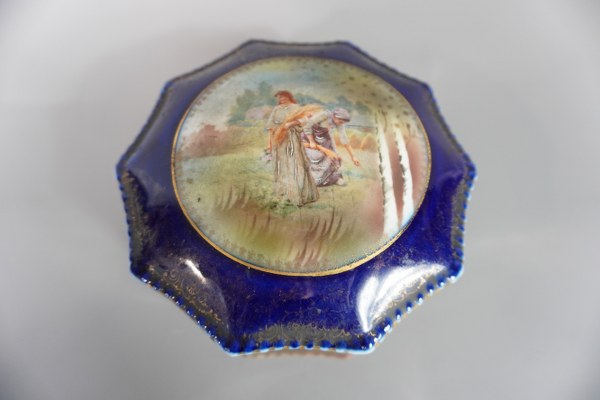 Bonbonnière en porcelaine à décor de fermières. 8x17cm.