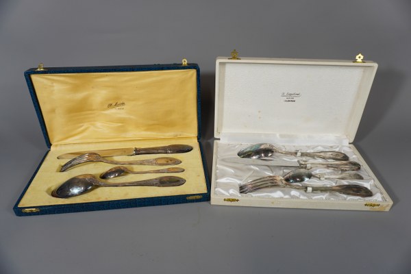 2 Couverts en métal argenté dans leurs écrins.