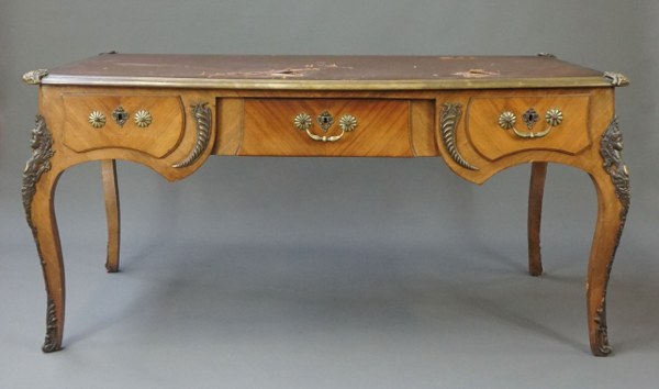 Bureau plat en placage d'acajou ouvrant par trois tiroirs en..