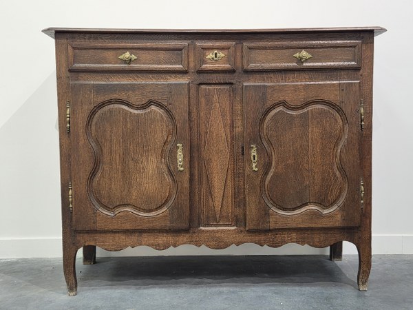 Buffet en chêne ouvrant à deux vantaux et trois tiroirs...