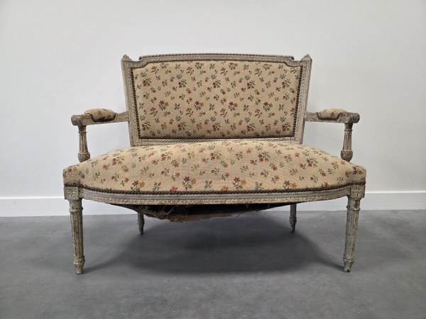 Canapé en bois mouluré blanc, garniture de tissu à fleurs..