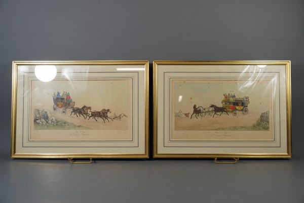 Paire de gravures en couleur "diligence Française Paris-Boulogne et Rouen-Le..