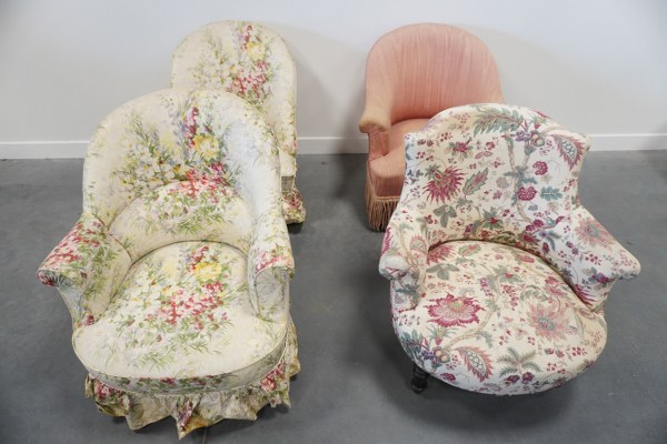 4 Fauteuils "chauffeuses" à tissus accidenté.