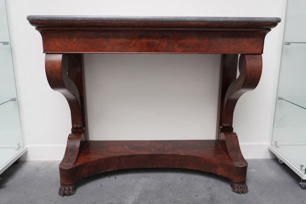 Console empire à pieds griffes dessus de marbre gris ouvrant..