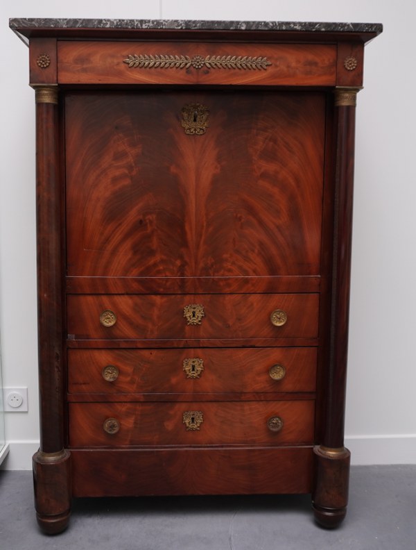 Secrétaire empire à colonnes détachées dessus de marbre gris ouvrant..