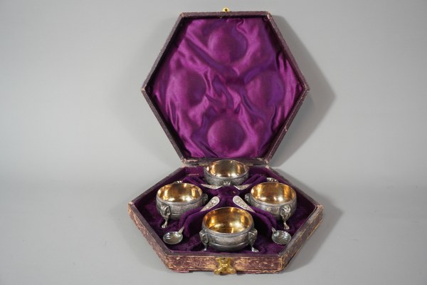 ELKINGTON. Quatre salerons à décor égyptien en métal argenté et..