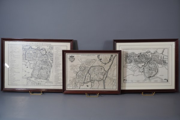 3 Gravures encadrées "plan de Caen" 37x50cm. 1 Verre cassé.
