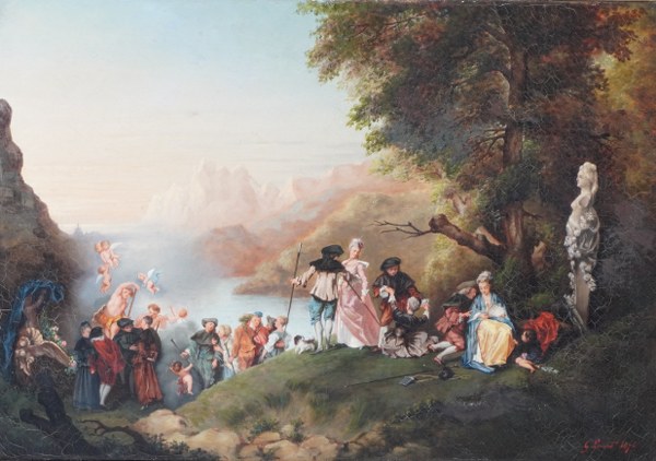 Huile sur toile "scène galante agrémenté d'amours dans les montagnes"..