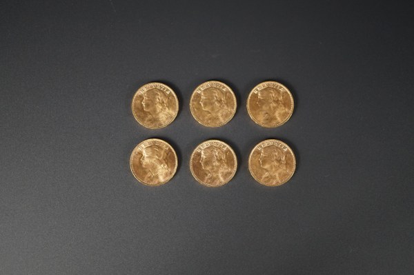 6 pièces de 20 francs or suisses.