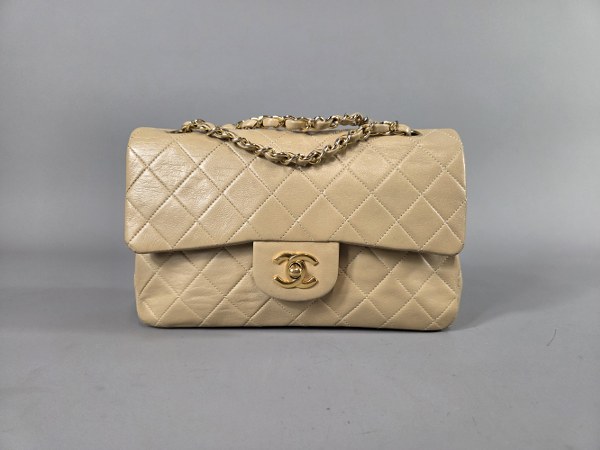 CHANEL. Sac Timeless en cuir matelassé beige, fermoir pivotant sigle..