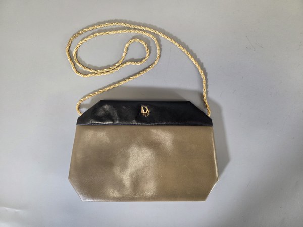 CHRISTIAN DIOR. Petit sac cérémonie cuir bicolore noir, taupe, anse..