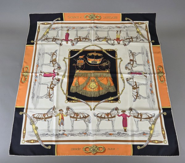HERMES. Carré en soie "Harnais à l'anglaise". Petites usures, tâches.