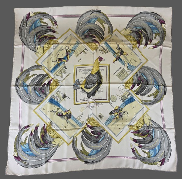 HERMES. Carré en soie "combat de coqs". Tâches, usures.