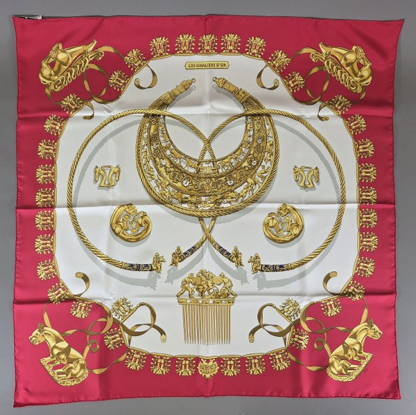 HERMES. Carré en soie les cavaliers d'or d'après un dessin..