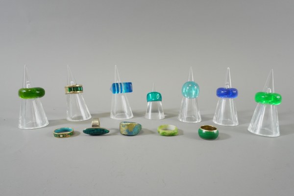 Lot de douze bagues de couleurs vert et bleu.