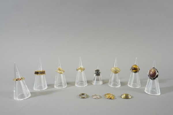 Lot de douze bagues fantaisie doré et marron.