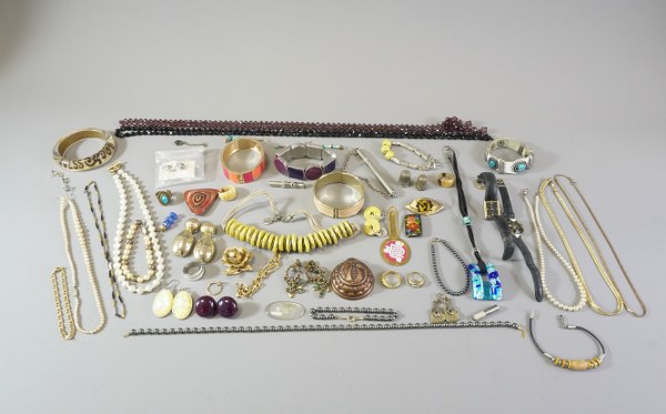 Un lot de bijoux fantaisie comprenant une pince à cravate..