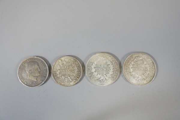Quatre pièces en argent comprenant deux pièces de 50 francs,..