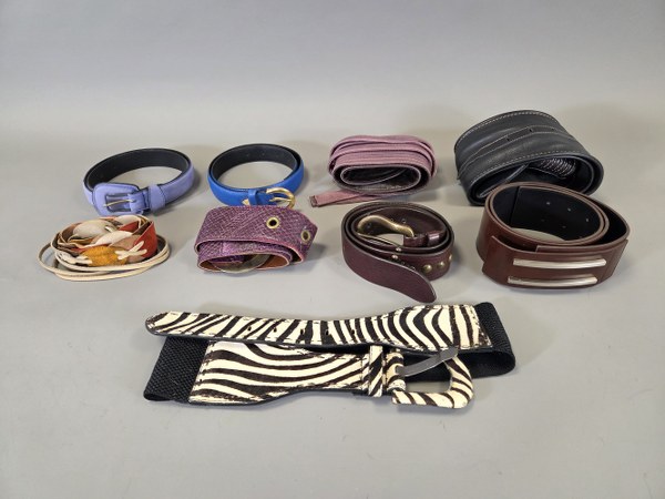 Lot de neuf ceintures en cuir, tissu de couleurs et..