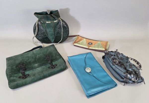 Ensemble de cinq sacs et pochettes dans les tons bleus..