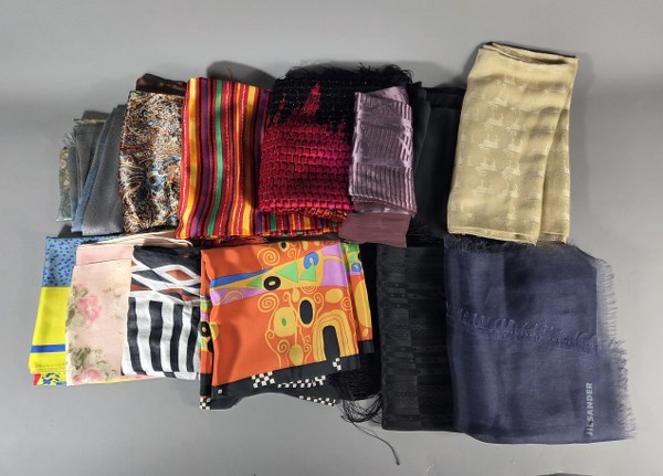 Ensemble de quatorze foulards de couleurs et motifs variés. Traces..