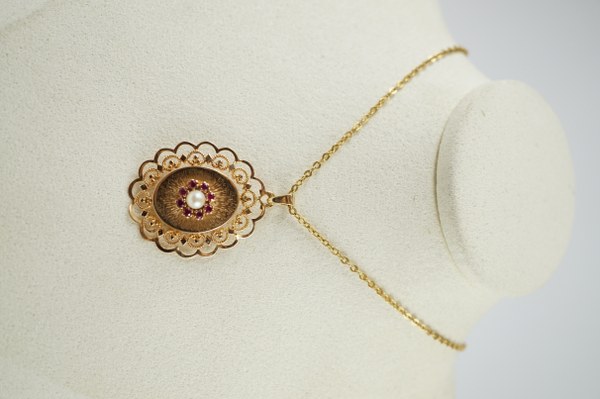 Pendentif centré d'une perle dans un entourage de rubis synthétiques..
