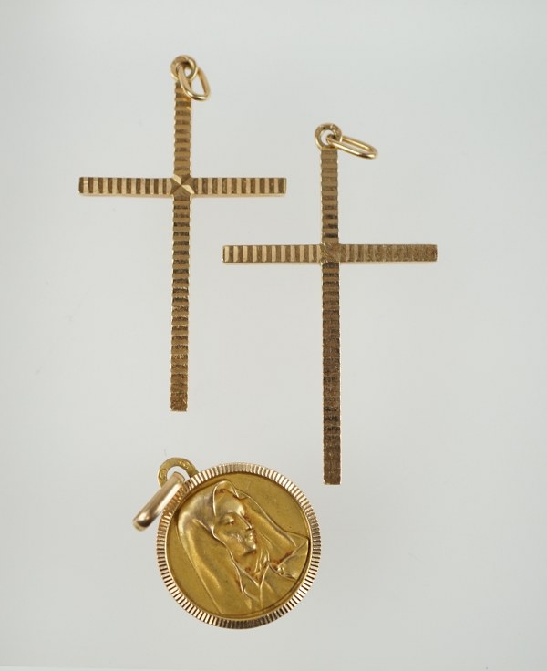 Deux croix et une médaille en or jaune (750°°°). Poids..