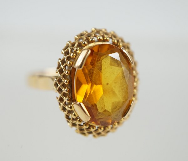 Bague en or jaune (750°°°) ornée d'une topaze facettée. TDD..