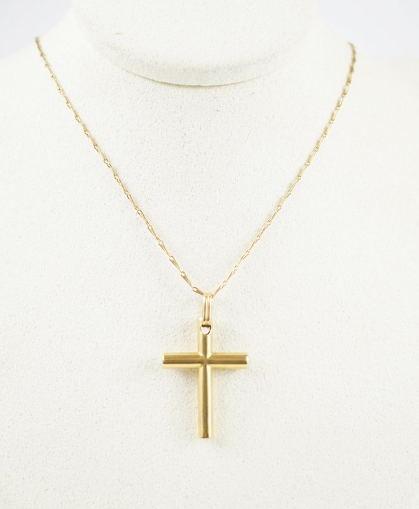 Chaîne et croix en or jaune (750°°°). Poids : 4,9..