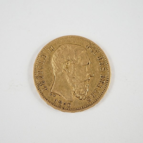 Une pièce de 20 francs or belge,Léopold II, 1870. Gravé..