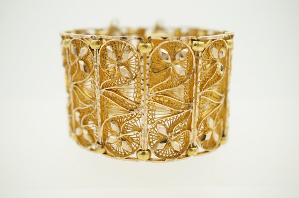 Bracelet manchette en or jaune (750°°°) à décor filigrané. Poids..