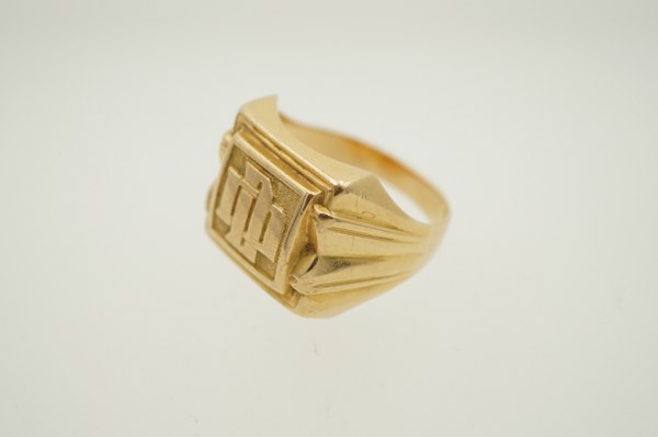 Chevalière en or jaune (750°°°) chiffrée. Poids : 13,6 grs.