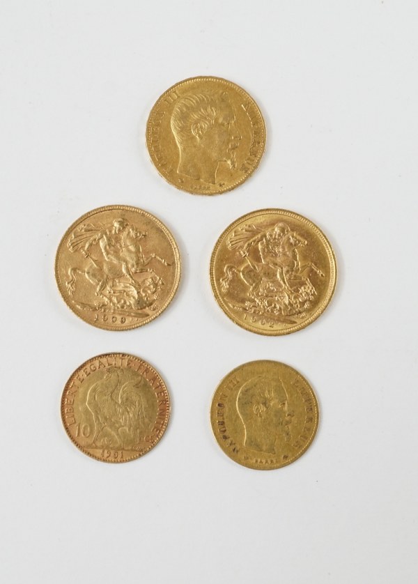 Lot comprenant deux pièces souverains or, une pièce de vingt..