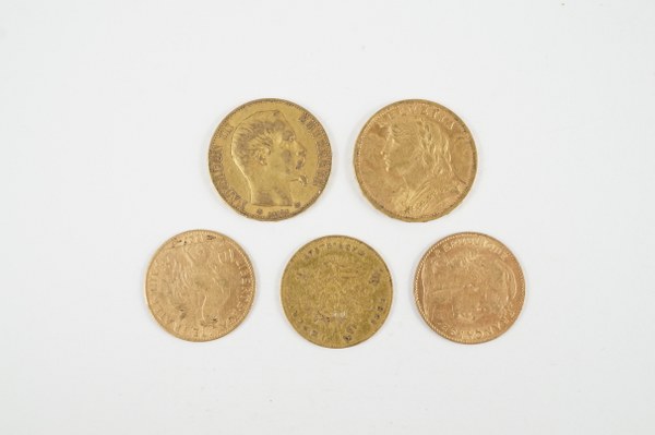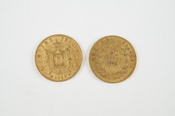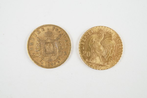 Deux pièces de dix francs or, une pièce de vingt..