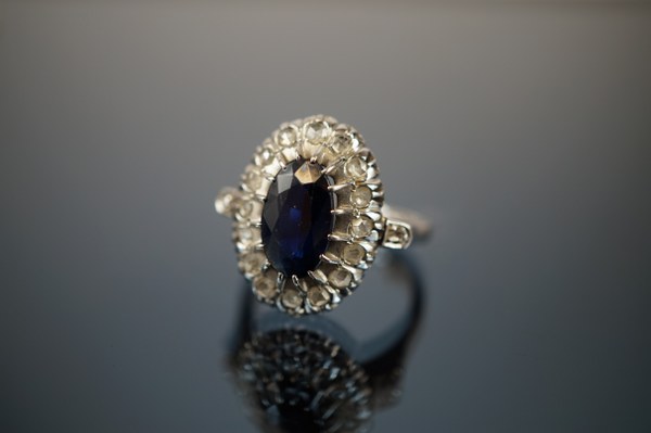 Bague en or gris 750 millièmes ornée d'un saphir ovale..