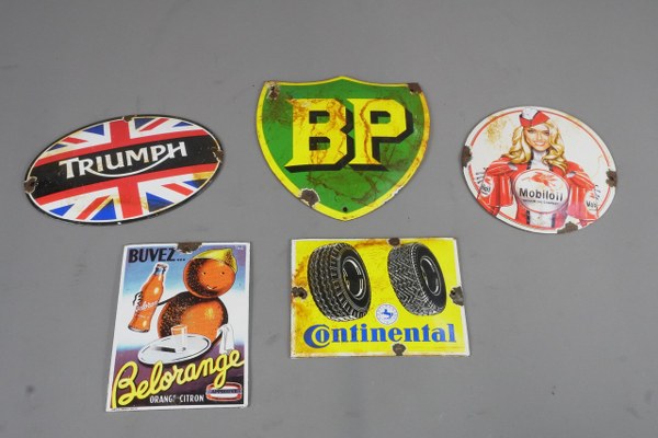 Ensemble de 5 plaques publicitaires émaillées dont BP 14x13,5cm, Belorange..