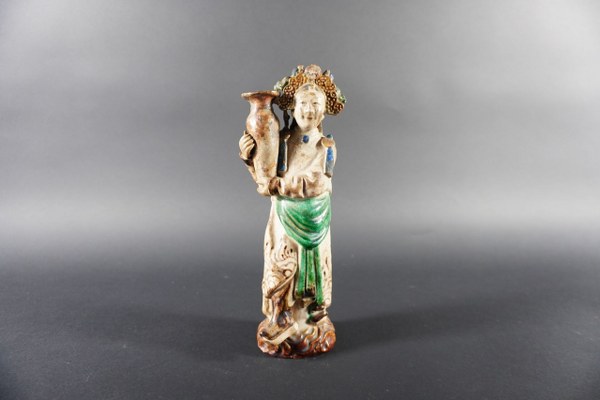 Statuette en grès émaillé polychrome représentant une femme à la..