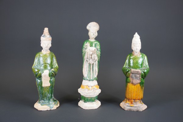 Trois statuettes de gardiens en grès émaillé vert. Chine, dynastie..