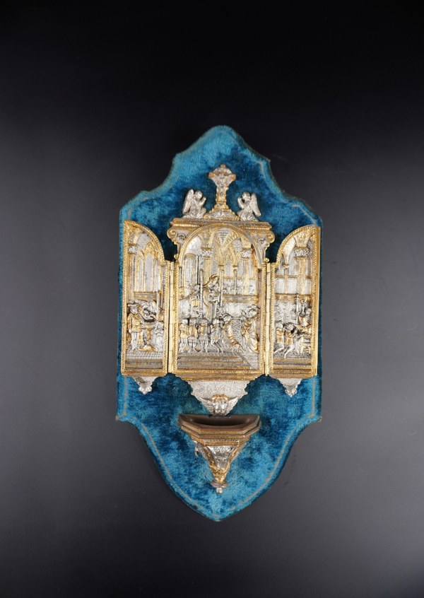 Bénitier triptyque en régule argenté et doré fixé sur un..