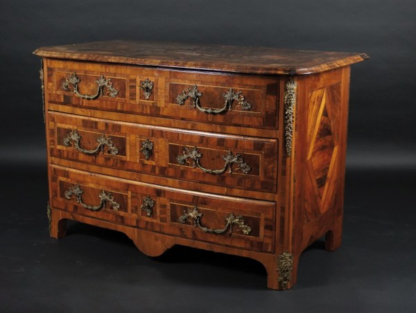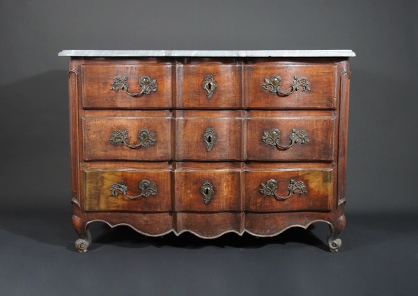 Commode en noyer de forme arbalète, ouvrant par trois tiroirs..