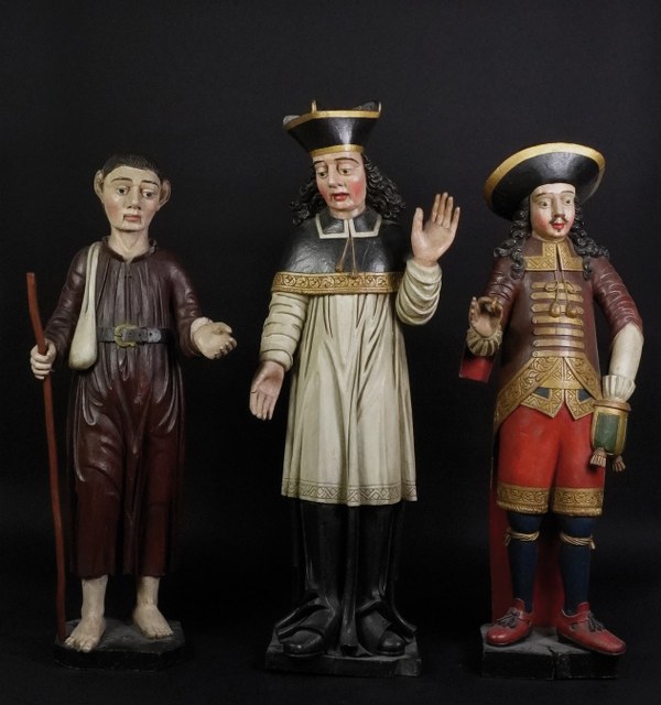 Groupe composé de trois personnages dits les Plaideurs. En bois..