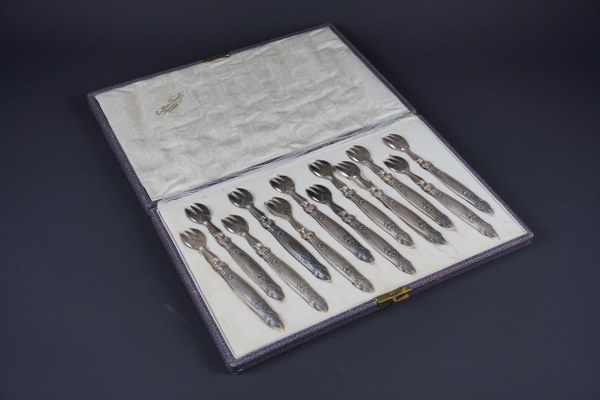 Suite de douze fourchettes à huîtres en argent fourré. Manche..