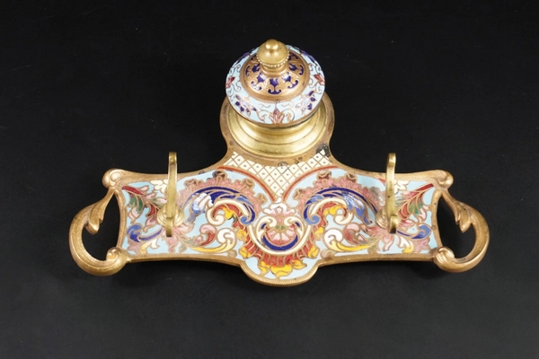 Encrier en bronze et cloisonné avec support de plumes. Époque..