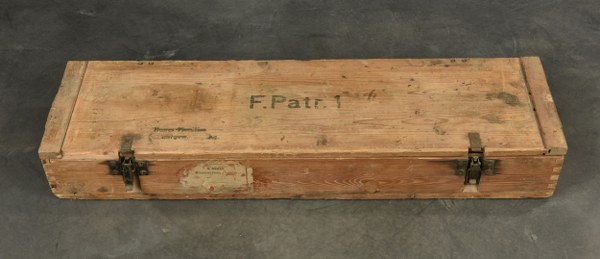 Caisse F Patronen. En bois. Les crochets sont présents. Poignées..