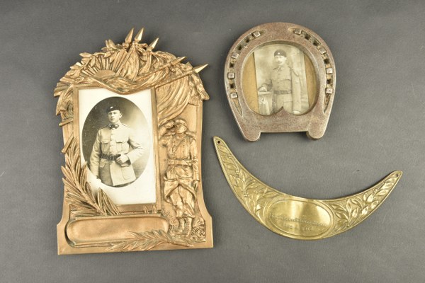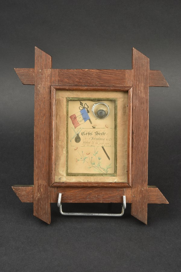 Reliquaire soldat blessé. Petit cadre contenant le shrapnel ayant blessé..