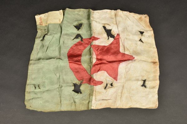 Drapeau du FLN. Confectionné en soie verte et blanche, croissant..