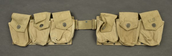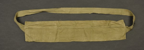 Bandoleer US. En toile kaki, six compartiments visibles. Sans marquages..